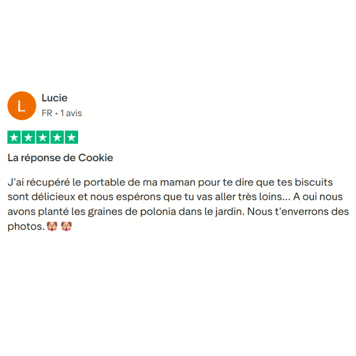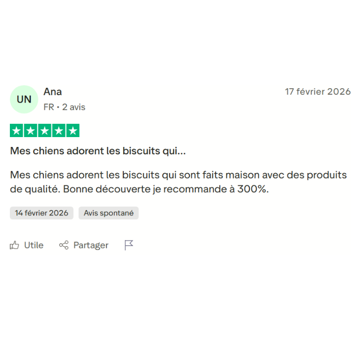 L’abonnement, c’est la garantie d’avoir toujours des biscuits frais pour votre chien, livrés chaque mois. Mais c’est aussi une façon d’éviter le gaspillage : grâce à vos abonnements, nous savons exactement quelles quantités préparer. Nous produisons juste ce qu’il faut, rien n’est perdu, tout est utilisé.